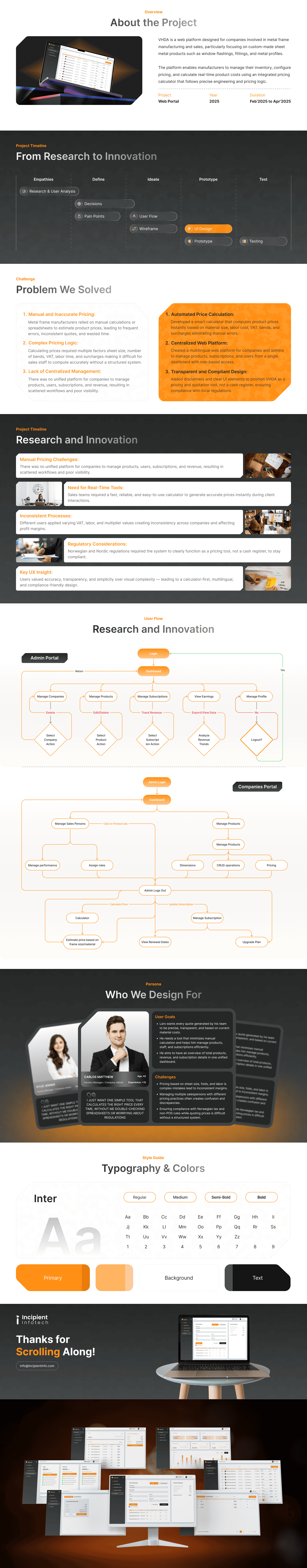 VHDA is a web platform designed for companies involved in metal frame manufacturing and sales, particularly focusing on custom-made sheet metal products such as window flashings, fittings, and metal profiles.The platform enables manufacturers to manage their inventory, configure pricing, and calculate real-time product costs using an integrated pricing calculator that follows precise engineering and pricing logic.